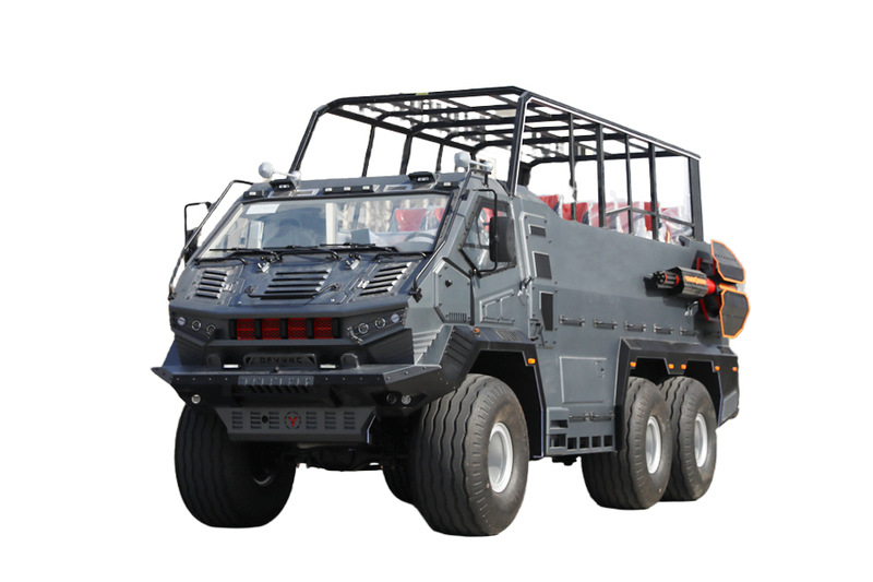 我公司研发设计了六驱沙漠景区冲浪车是一转定制化的非公路人员运输车,主要用于沙漠地区游客游玩使用,可乘坐18人。