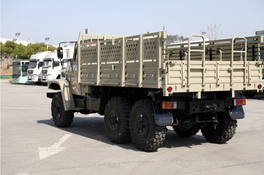EQ2082E6D也叫做EQ240或者25Y,是东风公司早期开发的一款2.5吨六驱军用长头柴油越野汽车,曾被称为“英雄车”,绞盘、灯网、防护网、防空灯、枪架、牵引装置、双油箱都是它的特点。由于经历过实战检验,越野性得到认可,所以后来也民用化。货箱尾板可向下翻开,后方装有2个折叠爬梯,内部可安装折叠座凳。同时配备有可拆卸的蓬布篷杆,可以防止雨水风沙。