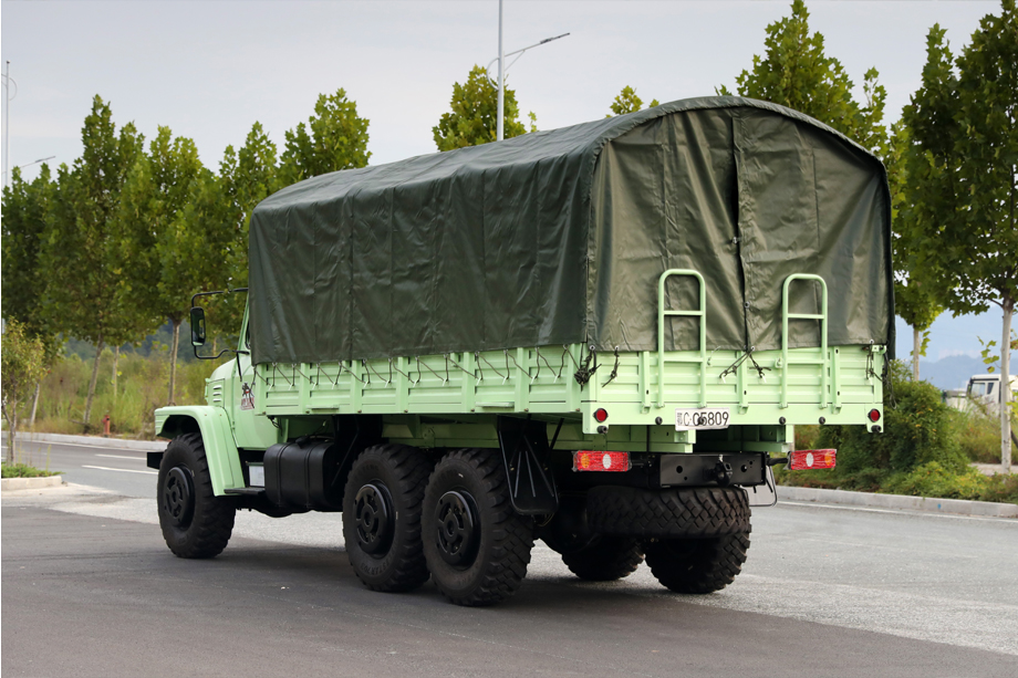 发动机带有预热功能,整车可以在-41℃环境温度下能顺利启动。货箱底板采用纯铁材质,带有防滑花纹。两侧边板安装有折叠座椅,货箱内部装有固定链条,尾箱板可开启,带有2个折叠爬梯。蓬布篷杆可拆卸,在风沙暴雨天气下,可以有效的保护货箱内的人员和物资。