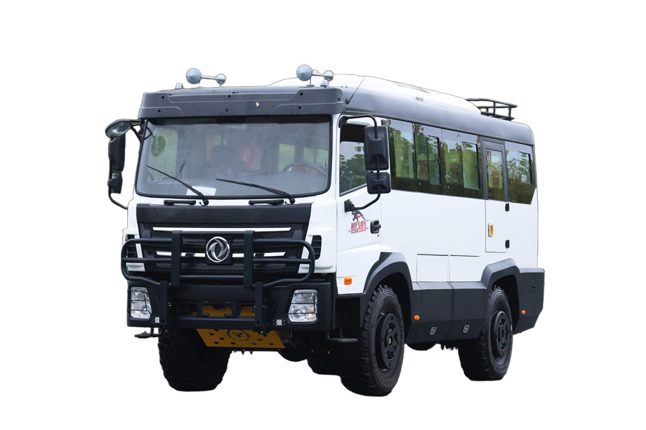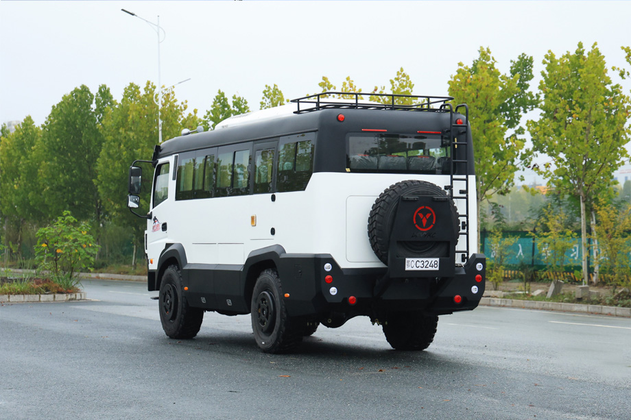 | 其他 | 车辆前方带防护栏; 车身右侧设有乘客门、加油口、备胎架控制器,乘客门为侧平移开启,内外均有应急开关; 车身左侧设有检修口、行李舱、加水口、应急门; 车尾设有电动备胎架、爬梯、行李舱; 车顶设有行李架、顶置空调、逃生天窗; 乘客区门口设有一处上车扶手;地板采用铝合金防滑花纹板,铝合金包边;乘客区窗户为单项推拉窗,带有窗帘和安全锤;轮胎带有充放气功能。 |