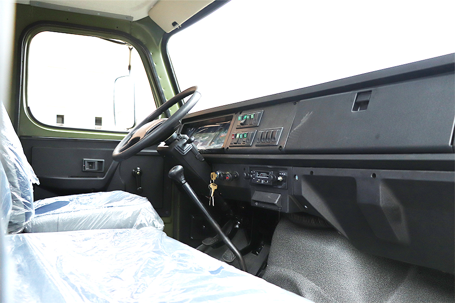 发动机带有预热功能,整车可以在-41℃环境温度下能顺利启动。货箱底板采用纯铁材质,带有防滑花纹。两侧边板安装有折叠座椅,货箱内部装有固定链条,尾箱板可开启,带有2个折叠爬梯。蓬布篷杆可拆卸,在风沙暴雨天气下,可以有效的保护货箱内的人员和物资。