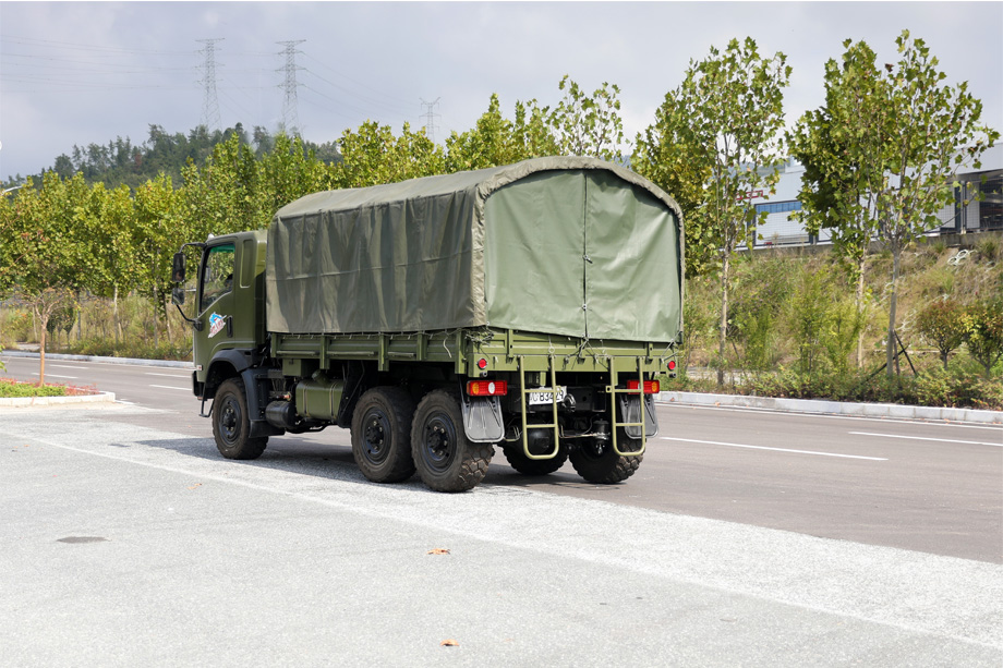 “山猫”六驱越野卡车,是我公司在东风经典车型EQ2082E6D二吨半长头柴油越野车的基础上改进而成。驾驶室采用平头一排半驾驶室,舒适豪华,视野宽敞。同样的长度,功能更加强大,货箱长4米,再越野路况下可承载2.5吨货物,平坦坚实的公路路面下至少可承载4吨。货箱底板采用纯铁材质,带有防滑花纹。两侧边板安装折叠座椅,尾部带有2个折叠爬梯。
