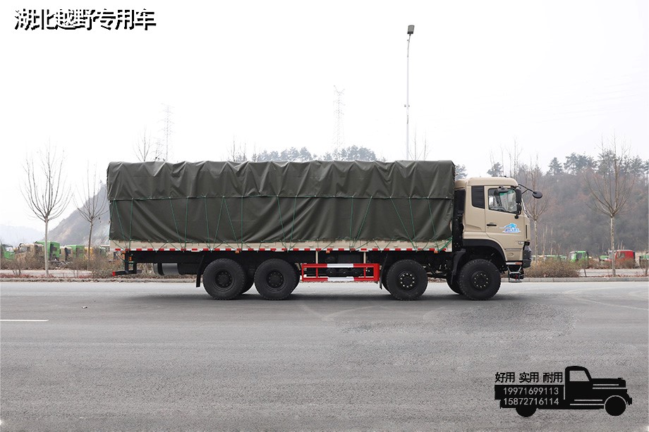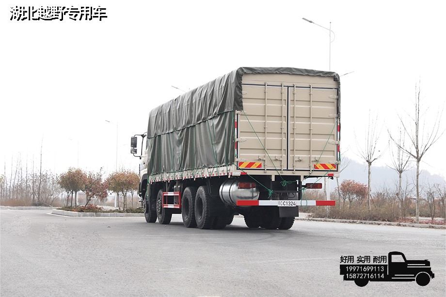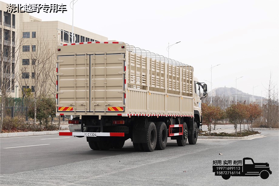 东风8*8越野型仓栅式运输车,采用康明斯450马力发动机,4根6.5吨越野车桥,不仅适合在恶劣路况下行驶,在平坦公路上行驶时速度丝毫不低该车常用于运输木材、牲口、果蔬、物流货箱等物品。